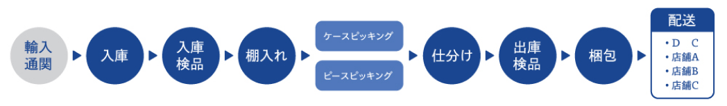 日本到着・通関後は、物流センターを経由せず、ダイレクトに店舗まで配送するサービスです。